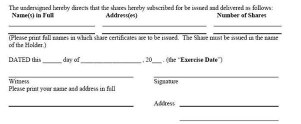 The right to purchase Shares conferred by the Warrants may be exercised by the Holder of such Warrant by surrendering it to the Company, with a duly completed and executed subscription in the form attached as Appendix “B” and cash, bank draft, certified cheque or money order payable to or to the order of the Company for the Aggregate Purchase Price subscribed for in lawful money of the United States of America.